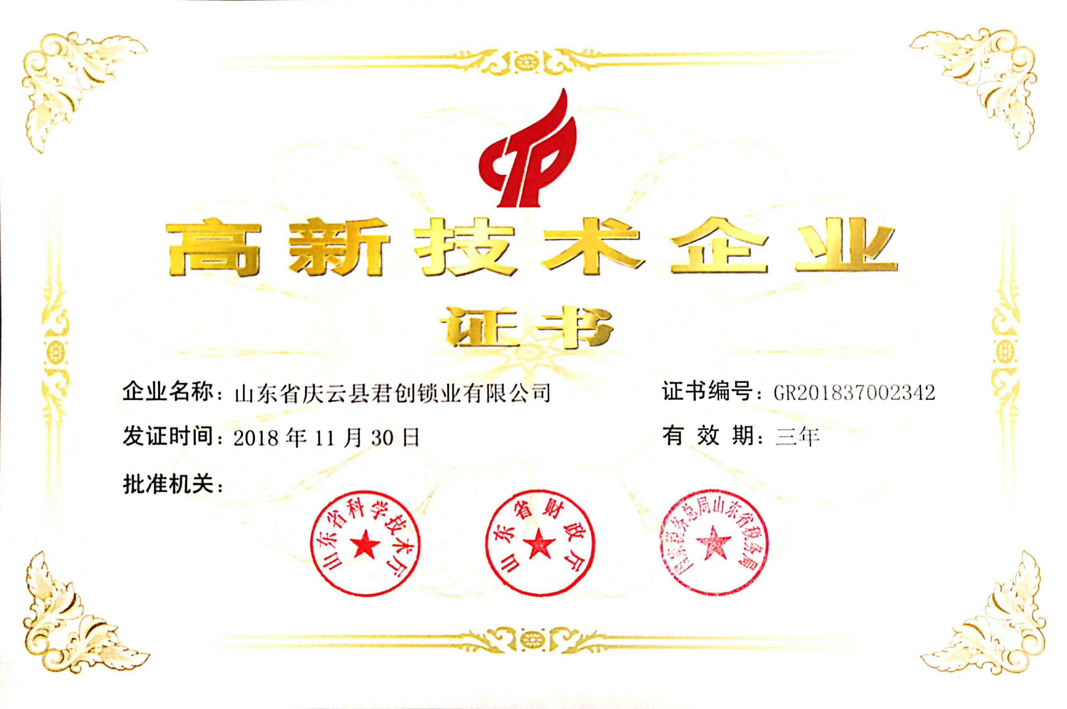 近日,青岛嘉懿智能设备销售有限公司喜迎佳音,获得了“国家高新技术企业证书”。这是青岛嘉懿智能设备销售有限公司继获得山东省产品质量奖、德州市信用民营企业、等荣誉后获得的一项新的荣誉。